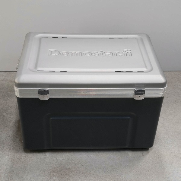 Plastikust, ratastega laadimiskast lukustava kaanega.