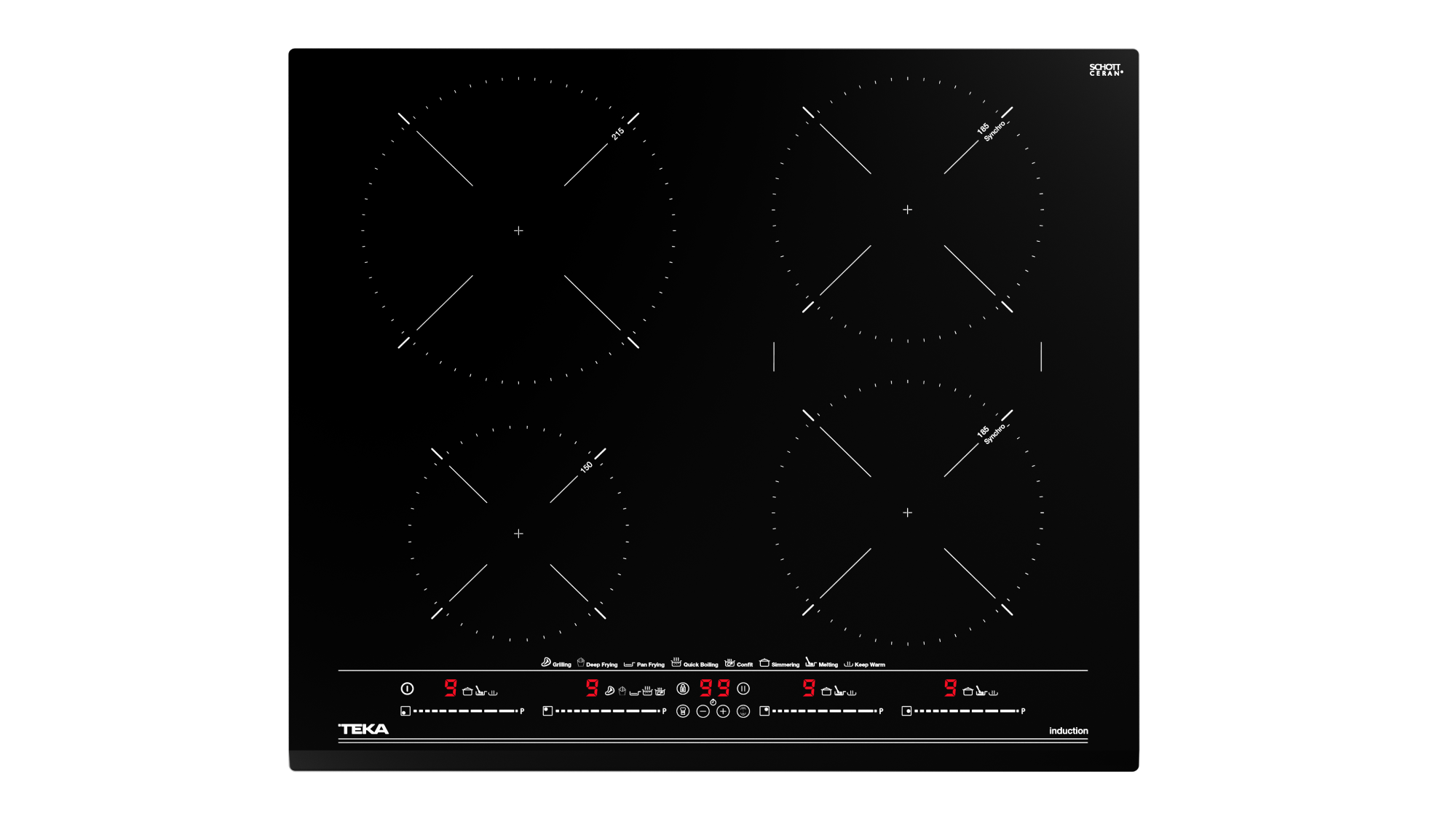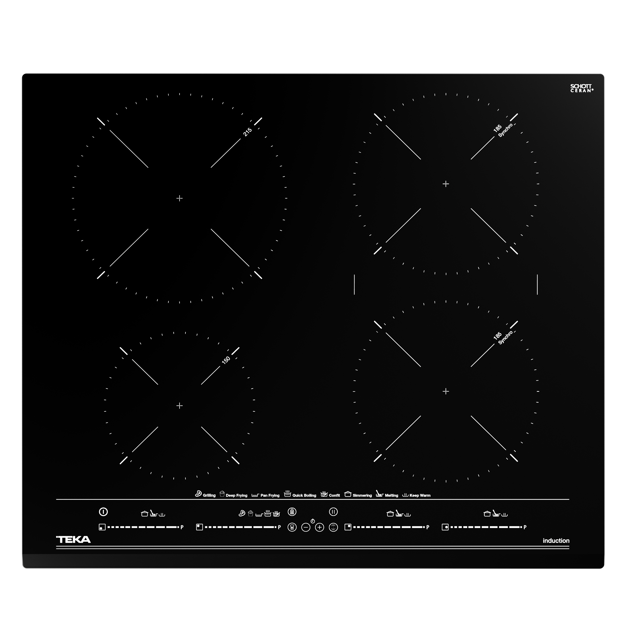Juhitavate keedualade arv 4 Funktsioonide arv 2 Kiirvalikuid 8 Võimsusastmeid 9 Juhtimisviis Liugjuhtimine Lapselukk + Taimer + Raamita + Faasitud servad Esiserv Power Management + Plaadi kõrgus, mm 53 Plaadi laius, mm 600 Plaadi sügavus, mm 510 Integreerimisava kõrgus, mm 49 Integreerimisava laius, mm 560 Koguvõimsus, W 7200