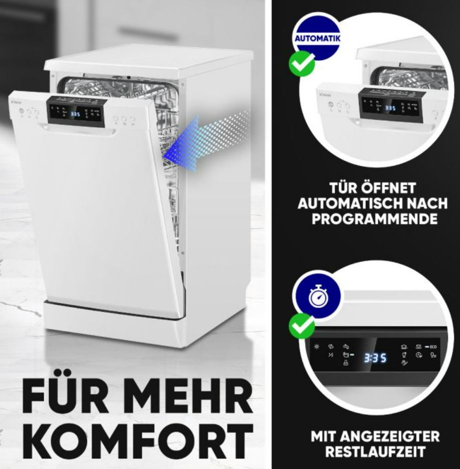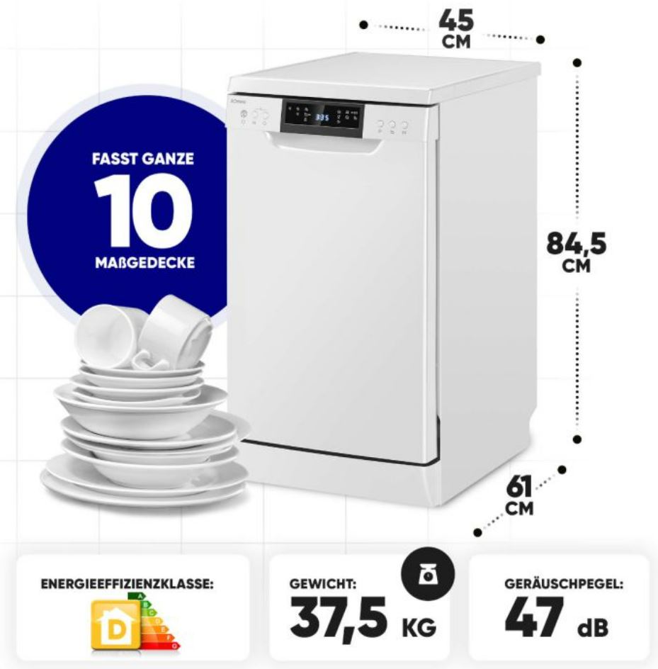 Mahutavus, nõudekomplekti 10 Eraldi sahtel söögiriistadele + Energiakulu, kWh 100 tsükli kohta 67 Kõrgus, cm 85 Müratase, dB 47 Energiaklass D Sügavus, cm 61 Veekulu, L tsükli kohta 9 Müraklass C Automaatne ukse avamine + Pesuprogrammid 7 LCD ekraan + Pesutemperatuurid 45°-72°C Digitaalne ekraan + Viitstart 1-24h Veelekke kontroll +