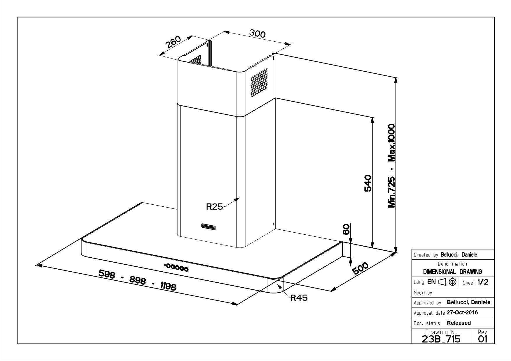 Tõmbevõimsus maksimaalne, m3/h 580 Tõmbevõimsus minimaalne, m3/h 270 Energiaklass A Tõmbevõimsus intensiiv m3/h 700 Müratase minimaalne, dB 50 Müratase maksimaalne, dB 65 Müratase intensiiv, dB 68 Äratõmbetõhususe klass A Rasva filtreerimise tõhususe klass C Valgustuse tõhususe klass A Võimsusastmed 3+1 Juhtimine Sensorjuhtimine Disain T-kujuline Perimeeter äratõmme + Värv Valge Mootori tüüp Difuuser Väljalaskeava läbimõõt, mm 150 Valgustus 1 Led LV 4000K Õhupuhastaja laius, mm 900 Õhupuhastaja sügavus, mm 500