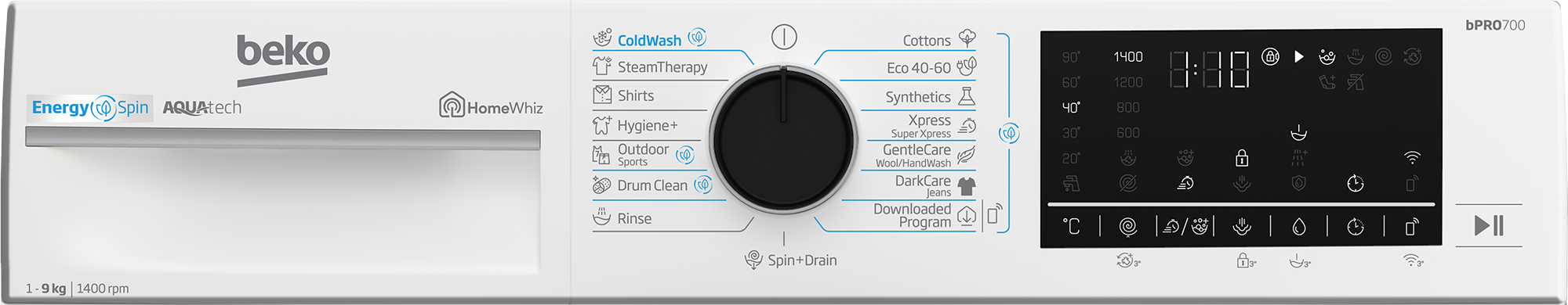 Kõrgus, cm 85 Müraklass tsentrifuugimisel B Energiaklass A Müratase tsentrifuugimisel, dB 75 Sügavus, cm 58 Veekulu, L tsükli kohta 40 Tsentrifuugimisklass B Puhastusprogramm + Maksimaalne tsentrifuugimiskiirus, p/min 1400 Pesemismaht, kg 9 Pesuprogrammid 15 Veekoguse automaatika + Laius, cm 60 Värv Valge